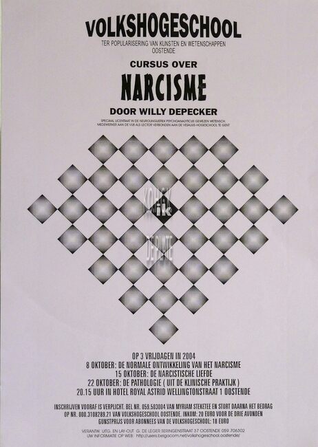 Affiche : Volkshogeschool. Narcisme. Hotel Royal Astrid. 8, 15 en 22/10/2004
