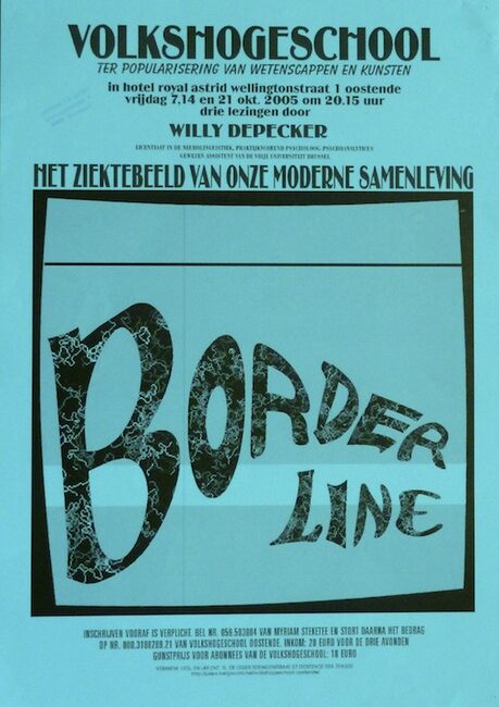 Affiche : Volkshogeschool. Borderline : het ziektebeeld van onze moderne samenleving. Hotel Royal Astrid. 7, 14 en 21/10/2005