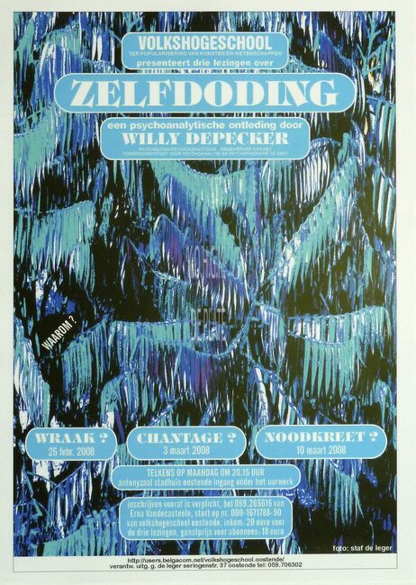 Affiche : Volkshogeschool. Zelfdoding. Antonyzaal stadhuis Oostende. 25/02, 3 en 10/03/2008