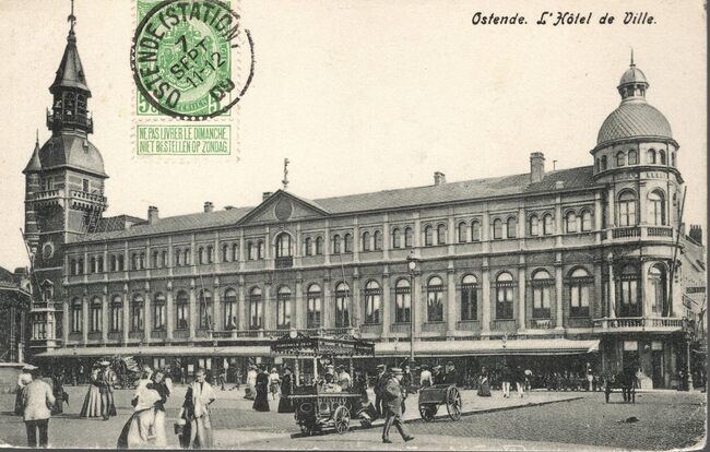 Edit. V.G. [=Victor Grégoire], 42, Avenue du Midi, Bruxelles. - Ostende - L'Hôtel de Ville. - Het Wapenplein met het stadhuis. Op de voorgrond, een ijscokar van Di Michele Jean, die in de stad altijd een vaste plaats…