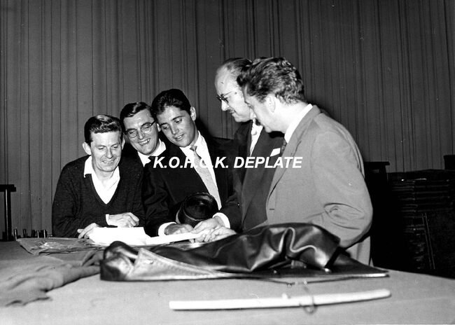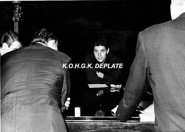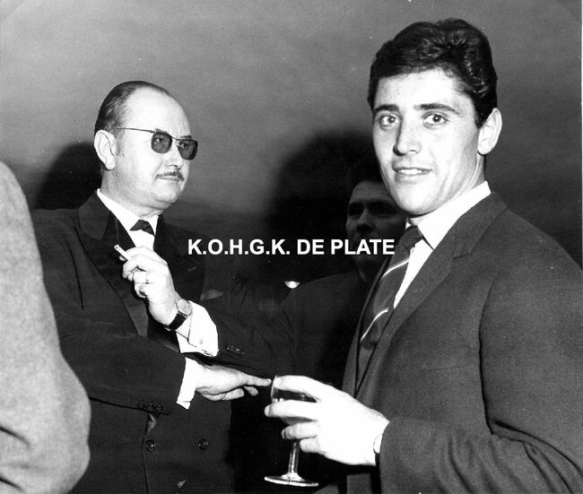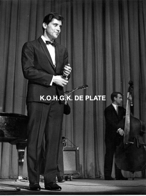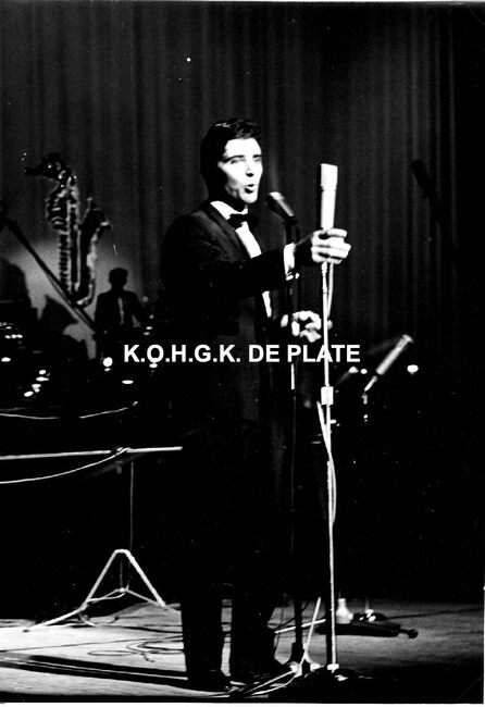 Formaat : 13 x 18 cm. - Sacha Distel in het gezelschap van o.a. Jean Raymond (rechts) en naast hem Roger De Ramée, directeur van het Kursaal. Jean Raymond, humorist en imitator, stond in het voorprogramma en trad ook op…