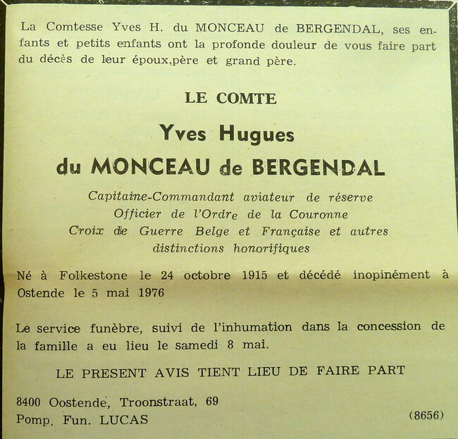 Advertentie : Doodsbericht Le comte Yves Hugues du Monceau de Bergendal