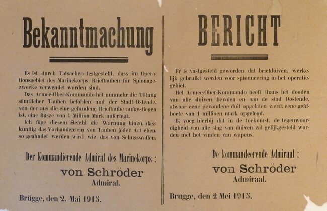 Formaat : 33 x 50 cm. Kennisgeving uitgaande van Admiraal von Schröder betreffende spionage met reisduiven.