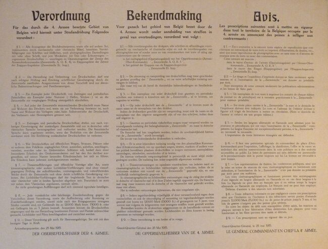 Formaat : 54 x 73 cm. Kennisgeving uitgaande van de opperbevelhebber van het 4de Leger betreffende de censuur op alle schriftelijke en fotografische publicaties