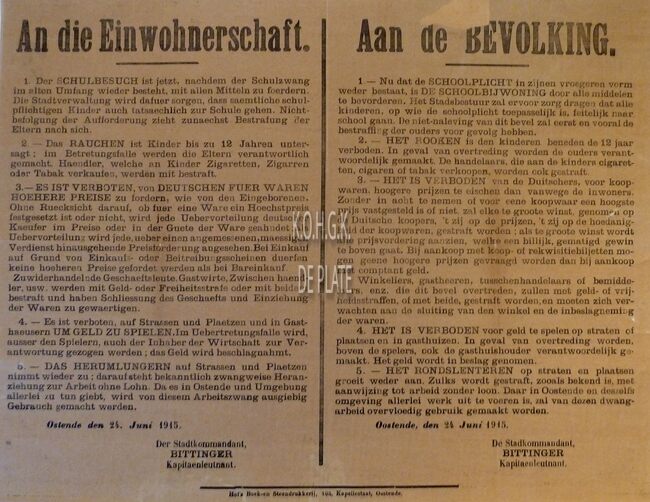 Formaat : 53 x 70 cm. Kennisgeving uitgaande van de Plaaatscommandant Bittinger van onderrichtingen betreffende het gebruik van de Duitse en Vlaamse talen, inbeslagname van hout, hoogste prijs aardappelen, …