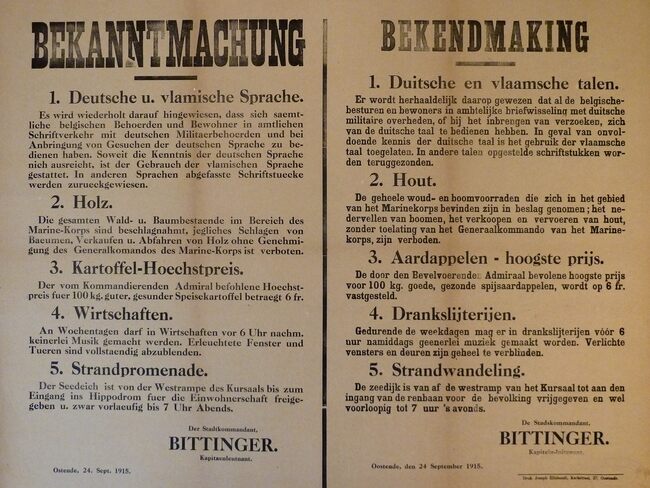 Formaat : 44 x 57 cm. Kennisgeving uitgaande van de Plaatscommandant Bittinger betreffende Franstalige en Engelstalige opschriften