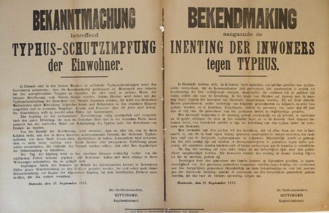 Formaat : 56 x 87 cm. Kennisgeving uitgaande van de Plaatscommandant Bittinger betreffende de verplichte inenting der inwoners tegen typhus