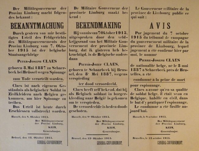 Formaat : 56 x 73 cm. Kennisgeving uitgaande van de militaire gouverneur van de provincie Limburg Generalmajor Keim betreffende de ter dood veroordeling en executie van Pieter Jozef Claes