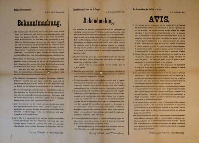 Formaat : 61 x 83 cm. Kennisgeving door de opperbevelhebber van het 4de Leger, Herzog Albrecht von Württemberg, van de onderrichtingen betreffende het betreden en sabotage van spoorweginstellingen, het herbergen…