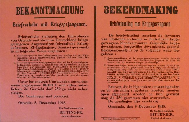 Formaat : 37 x 55 cm. Kennisgeving uitgaande van de Plaatscommandant Bittinger betreffende de briefwisseling met krijgsgevangenen
