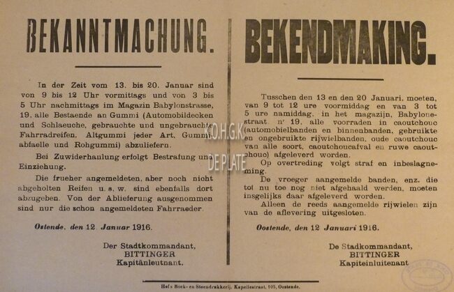 Formaat : 36 x 56 cm. Kennisgeving uitgaande van de Plaatscommandant Bittinger betreffende het binnenleveren van rubberen voorwerpen