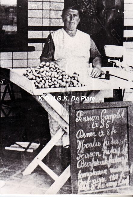 De Groentemarkt en de hoek met de Dwarsstraat onder water na de overstroming van 01-02-1953. Naast de "Franco Belge" (links), de zeer gekende Oostendse dancing : de "Valentino". Op de hoek van de…