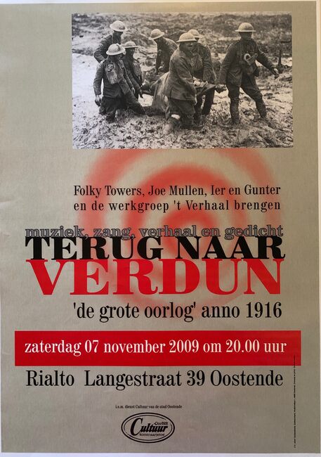 Affiche : Folky Towers, Joe Mullem, Ier en Gunter en de werkgroep 't Verhaal. Terug naar Verdun. Rialto. 07/11/2009