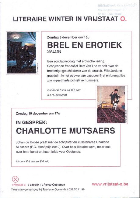 Formaat : 30 x 21cm. Zondag 5 december om 15u. Brel en erotiek : salon. Een zondagmiddag met erotische lading. Schrijver en francofiel Bart Van Loo vertelt over de broeierige geschiedenis van de erotiek. Filip Jordens…