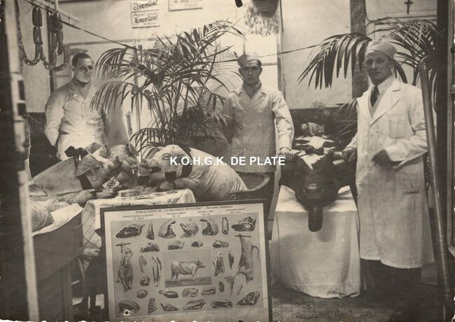 Formaat : 12 x 17 cm. - Op Witte Donderdag werden de etalages van de slagerijen speciaal versierd, zo ook bij slagerij Hillewaere. V.l.n.r. Miel Deslaghter, Remy Hoornaert (knecht) en André Hillewaere