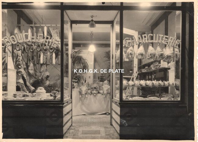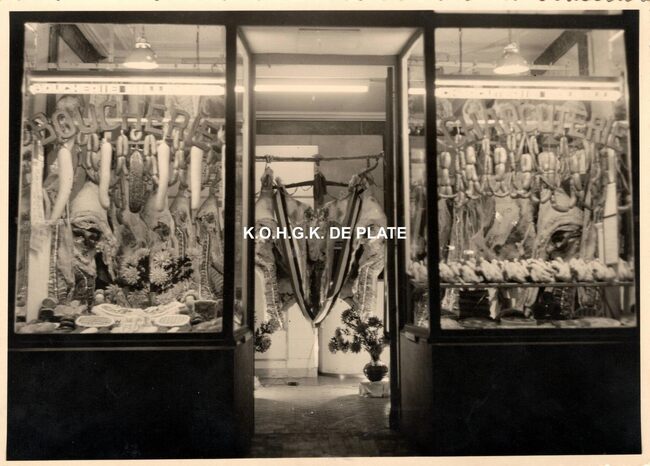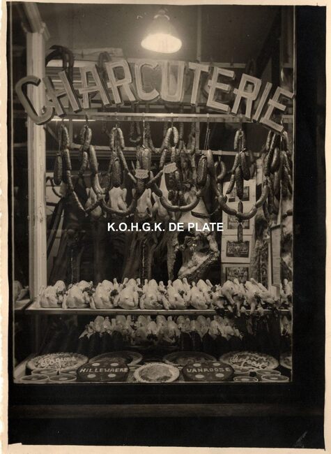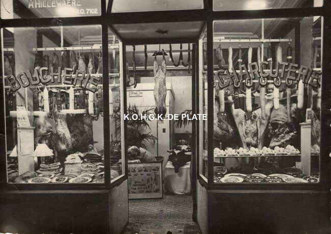 Formaat : 18 x 13 cm. - Op Witte Donderdag werden de etalages van de slagerijen speciaal versierd, zo ook bij slagerij Hillewaere kant charcuterie