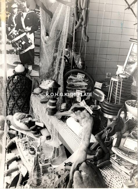Formaat : 18 x 13 cm. - Op Witte Donderdag werden de etalages van de slagerijen speciaal versierd, zo ook bij slagerij Hillewaere. Hier een detail van de etalage met als thema Zeemacht
