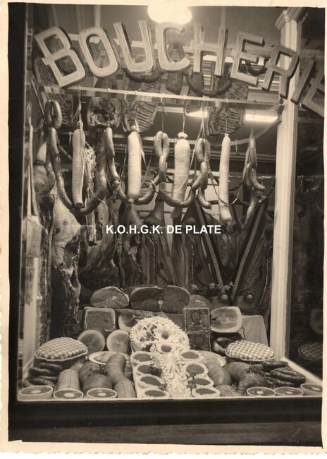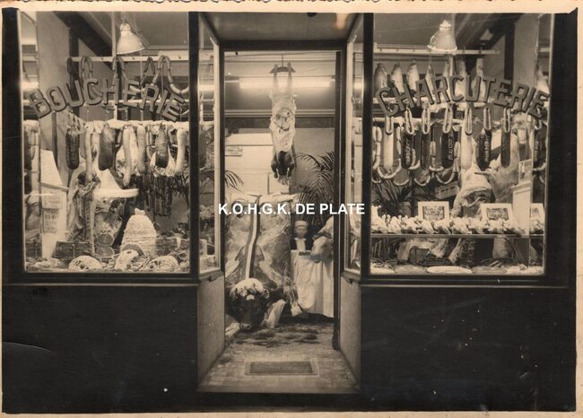 Formaat : 16,5 x 12 cm. - Op Witte Donderdag werden de etalages van de slagerijen speciaal versierd, zo ook bij slagerij Hillewaere, kan boucherie