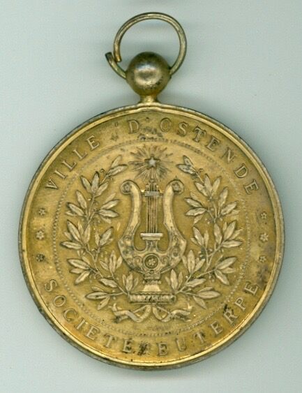 Op de voorzijde : rondom ❃❃❃ VILLE D’OSTENDE ❃❃❃ SOCIETE EUTERPE, centraal in een parelcirkel een lier met aan beide…