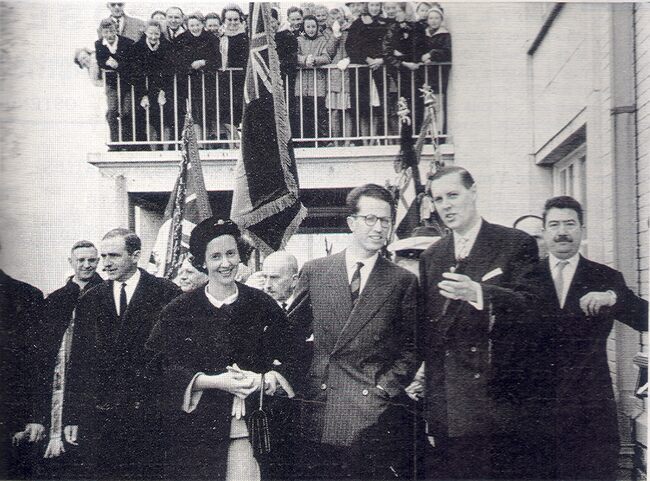 Formaat : 13 x 18 cm. - De O.1 "Fabiola" het huwelijksgeschenk van de Stad Oostende aan Koning Boudewijn en Koningin Fabiola, in het Montgomerydok. Tussen de koning en de koningin, Pierre van Outryve d'…