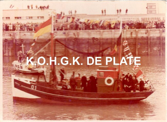 Foto : 13 x 18 cm. - Het vissersvaartuig O.1 "Fabiola", het huwelijksgeschenk van de Stad Oostende aan onze vorsten. Samen met o.a. burgemeester Jan Piers op het achterdek. Het vissersvaartuig in het…