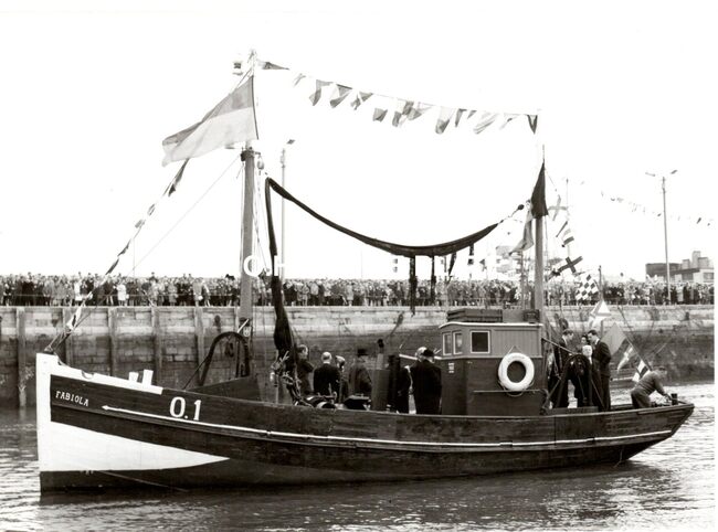 Vergroting. - Formaat : 28 x 40 cm. - Het vissersvaartuig O.1" Fabiola", huwelijksgeschenk van de Stad Oostende aan Koning Boudewijn en Koningin Fabiola, in het Montgomerydok.