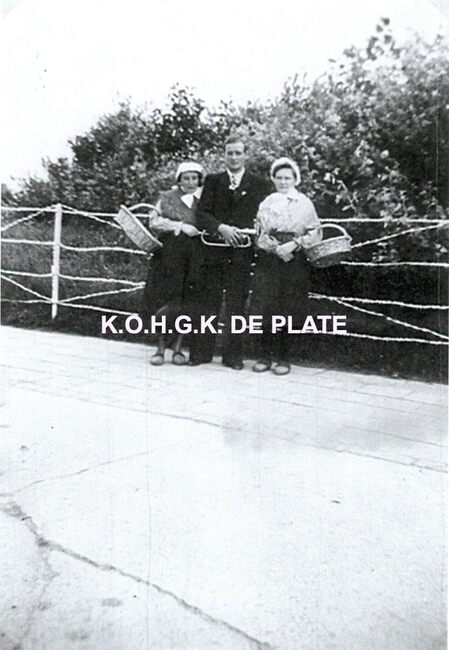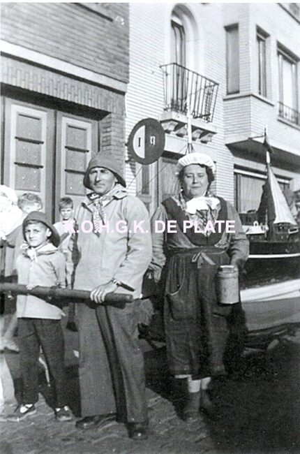 Formaat : 15 x 21,5 cm. - "De Vismijnvrienden" in traditionele visserskledij voor het "Windsor Castle Hotel" op het (Sint Petrus en Paulusplein 10)?.