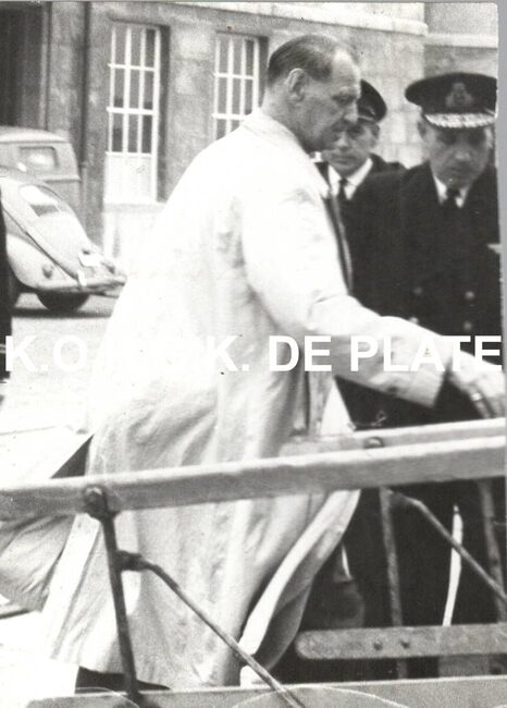 Formaat : 13 x 18 cm. - Zij kwamen aan in het Zeestation en waren op doorreis naar Engeland. We zien de vorst in het midden acheraan, met links schepen Maurice Quaghebeur sr. en rechts stadssecretaris Michel Surmont. De…