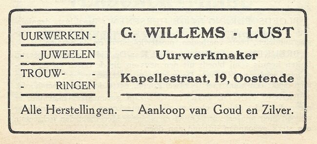 Advertentie : G. Willems-Lust. Uurwerkmaker. Kapellestraat, 19 Oostende