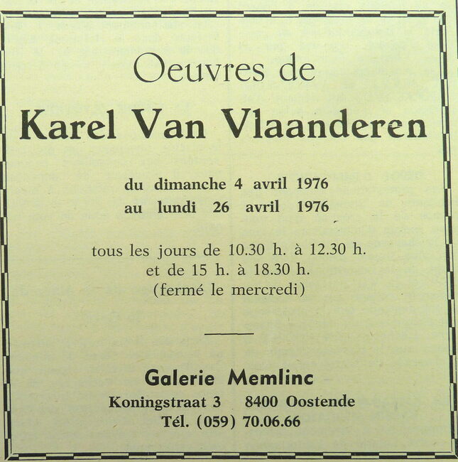 Advertentie : Oeuvres de Karel Van Vlaanderen. Galerie Memlinc. 04-26/04/1976