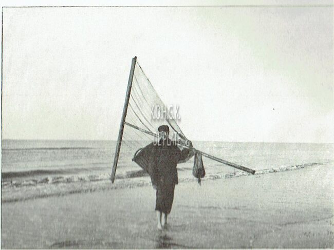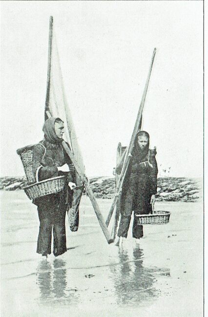 Twee garnalenkruisters met hun steeknet of stootkor. Op hun rug dragen zij met twee draagbanden een ovale rugmand om de garnalen in te bewaren, meestal nadat ze eerst gezeefd zijn. Vissen met de stootkor was voor die…