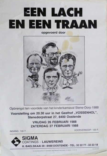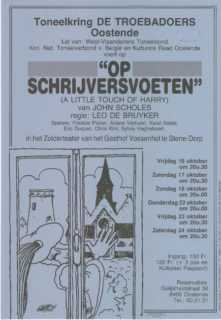 Formaat: Tragi-komedie in 3 bedrijven door Marcel Lambrechts. Regie: Roland Struys. Techniek: André Vandaele. Toneelmeester: Albert De Ruwe. Met in de rolverdeling: Roland Struys, Cecile Devolder, Caroline Van…