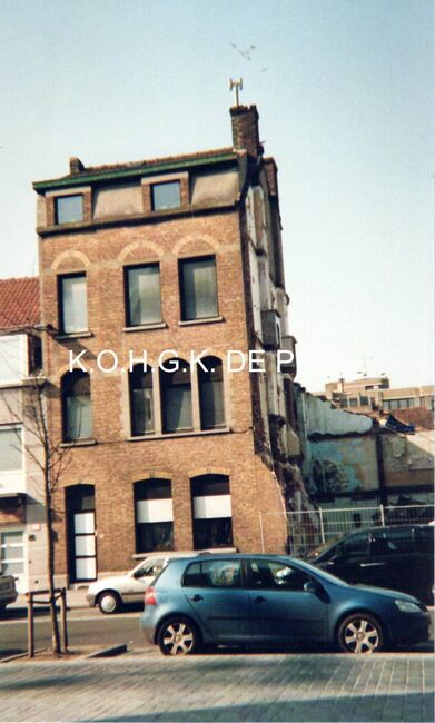 Formaat : 10 x 15 cm. - Het gebouw stond op de hoek van de Tweebruggenstraat en werd afgebroken voor de aanleg van het laatste gedeelte van de R31 (Ringlaan)