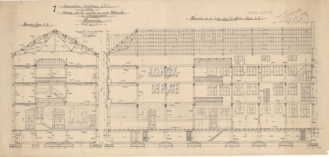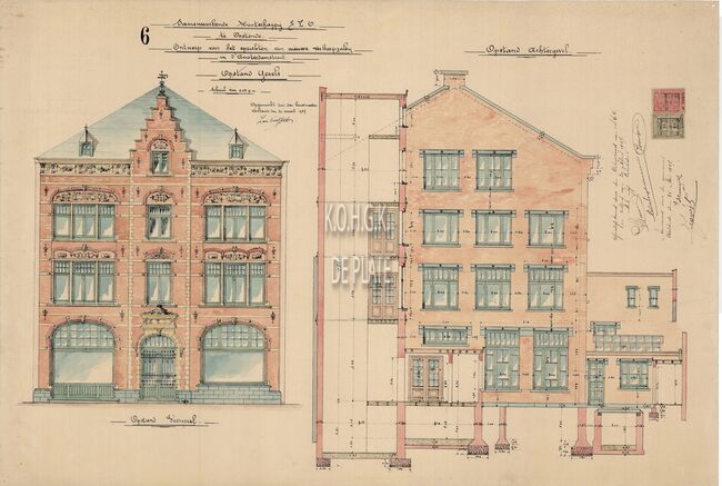 Opstand voorgevel en achtergevel. Gekleurd. In dit gebouw waren de magazijnen : nr.12 : Beenhouwerij ; nr.13 : Stoven ; nr.14 : Groenten ; nr. 15 : Gleiswaren en nr.16 : Meubels.