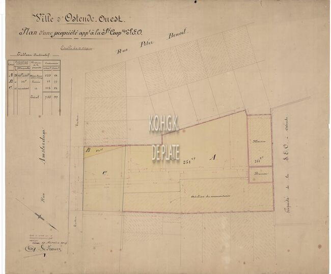 Metingsplan van het perceel grond in de Amsterdamstraat waarop SEO zal bouwen. Opgemaakt door de beëdigd landmeter Antoine De France