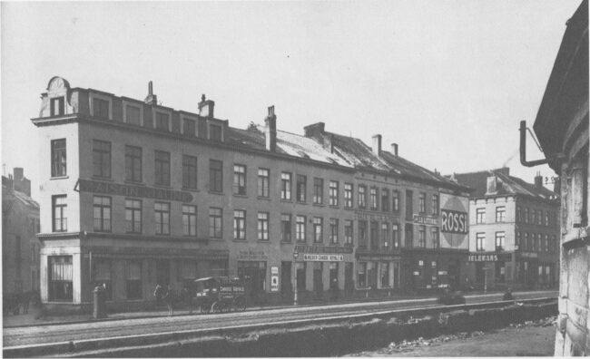 Huizenrij gelegen tussen het Sint Petrus en Paulusplein (links) en de Sint-Franciscusstraat (rechts). Van links naar rechts : detail van "Hôtel Au Nouveau Passage", "Estaminet H. Lauwereins-Dequick", het café "Weduwe Deckmyn…