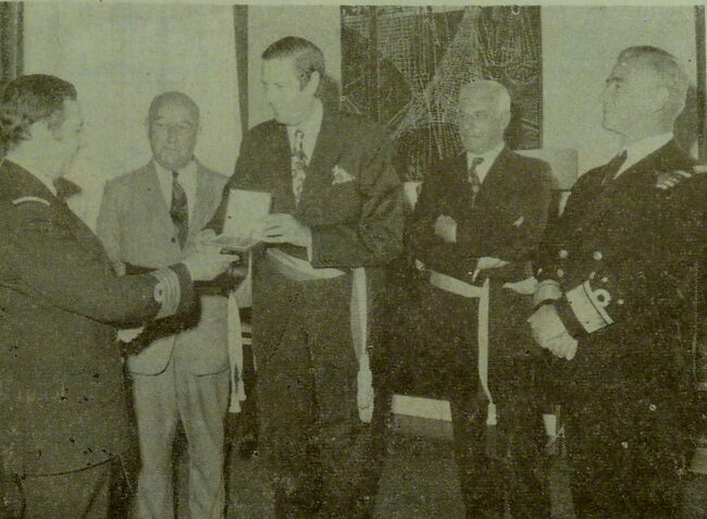 Koning Boudewijnin gesprek tijdens de inhuldiging van de Vismijn. De officier naast de koning is Daniël Geluyckens, ordonnanceoffiier. Hij was ordonnanceofficier van 1950-1959.