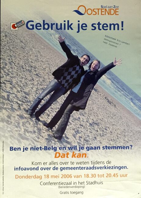 Affiche : Gebruik je stem. Ben je niet-Belg en wil je gaan stemmen ?. Infoavond over de gemeenteraadsverkiezingen. Conferentiezaal Stadhuis. 18/05/2006