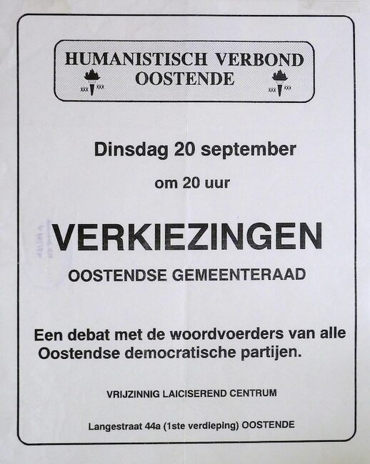 Affiche : Humanistisch Verbond Oostende. Verkiezingen Oostendse gemeenteraad. Vrijzinnig Laïciserend Centrum. 20/09/....(?)