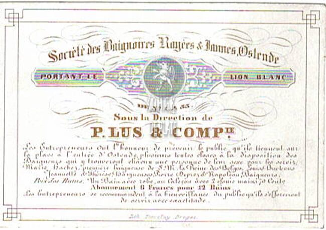 Afmeting : 7,6 x 11 cm. - Société des Baignoires Rayées & Jaunes, Ostende. Portant le lion blanc. De N° 1 a 33. Sous la Direction de P. Lus & Comp. Les entrepreneurs ont l'honneur de prévenir le public qu…