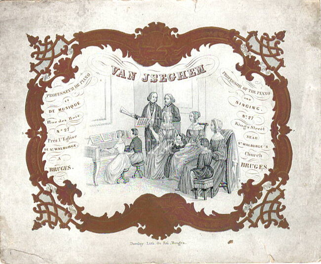 Afmeting : 13,5 x 16,7 cm. - Van Iseghem, Professeur de piano et de musique, Rue des Rois N° 27 Prés L'Eglise de St Walburge a Bruges. Professor of the piano and singing N° 27 King's street near St Walburge…
