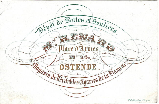 Formaat : 7,8 x 10 cm. - Dépôt de Bottes et Souliers Mme Renard Place d'Armes N° 15 Ostende. Magasin de Véritables Cigarres de la Havane. Lits à Ressorts. Savons et Parfumeries.