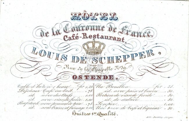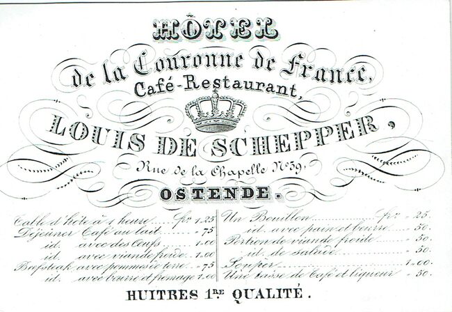 Formaat : 7,1 x 10,6 cm. - Hôtel de la Couronne de France. Café-Restaurant. Louis De Schepper, Rue de la Chapelle n° 39 Ostende. Huîtres 1re qualité.