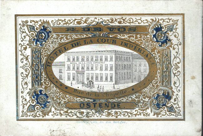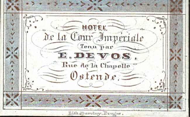 Formaat : 3 x 4,8 cm. -Hôtel de La Cour Impériale tenu par E. De Vos, Rue de la Chapelle Ostende