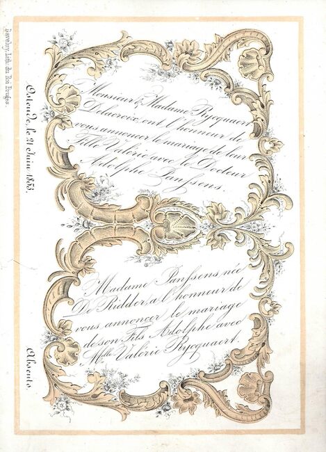Formaat : 17,2 x 13,2 cm. - Monsieur & Madame Rycquaert Delacroix ont l'honneur de vous annoncer le mariage de leur Fille Valérie avec le Docteur Adolphe Janssens / Madame Janssens née De Ridder a l'honneur…