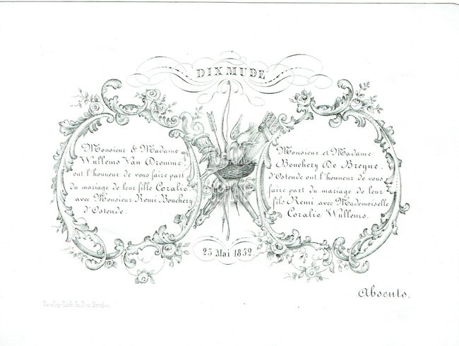 Formaat : 13,3 x 17,8 cm. - Monsieur & Madame Wullems Van Dromme ont l'honneur de vous faire part du mariage de leur fille Coralie avec Monsieur Remi Bouchery d'Ostende / Monsieur et Madame Bouchery De Breyne d'…