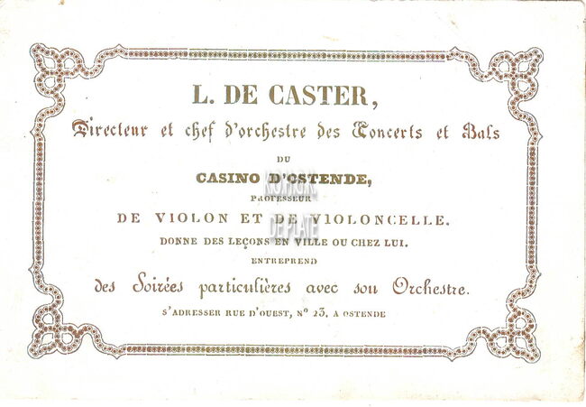 Formaat : 7,8 x 11,2 cm. - L. DE CASTER, Directeur et chef d'orchestre des Concerts et Bals du Casino d'Ostende. - Professeur de Violon et de Violoncelle, donne des leçons en Ville et chez lui entreprend des…