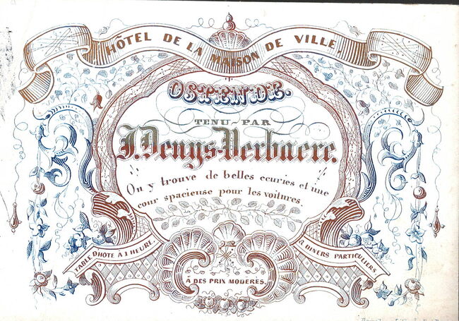 Formaat : 8 x 11,6 cm. - Hôtel de la Maison de Ville- OSTENDE. tenu par J. Denys-Verbaere. On y trouve de belle écuries et une cour spacieuse pour les voitures. Table d'hôte à l'heure - à diners particuliers - à des…