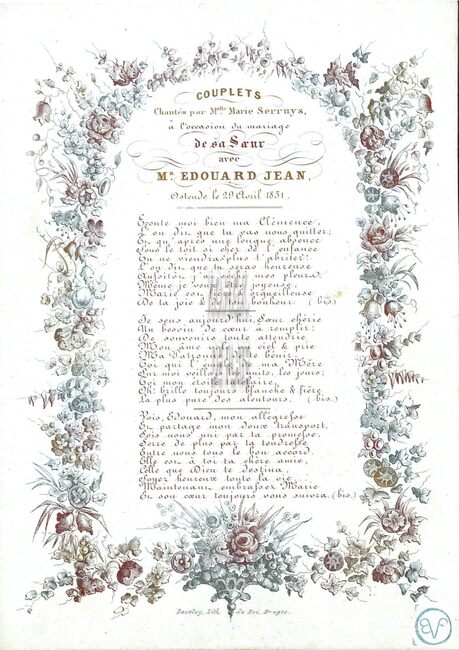 Formaat : 17 x 12 cm. - Couplet chantés par Melle Marie Serruys, à l'occasion du mariage de sa soeur avec Mr Edouard Jean