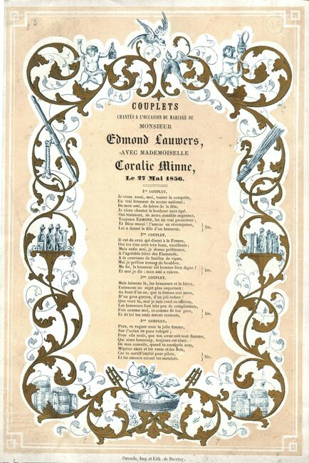 Formaat : 23,3 x 15,7 cm. - Couplets chantés à l'occasion du mariage de Mr Edmond Lauwers avec Mademoiselle Coralie Minne, le 27 Mai 1856